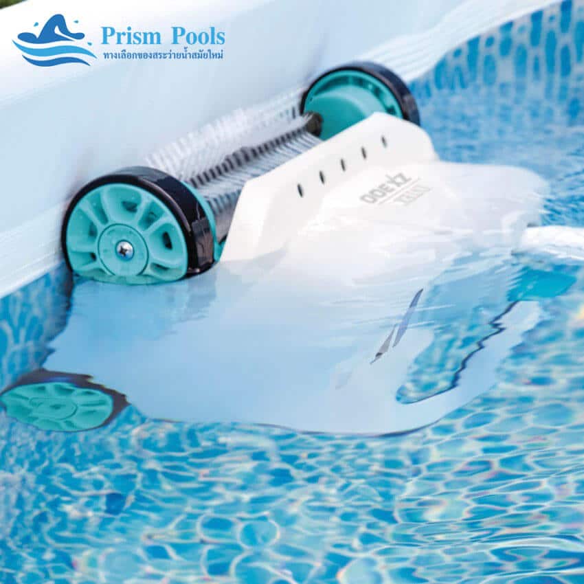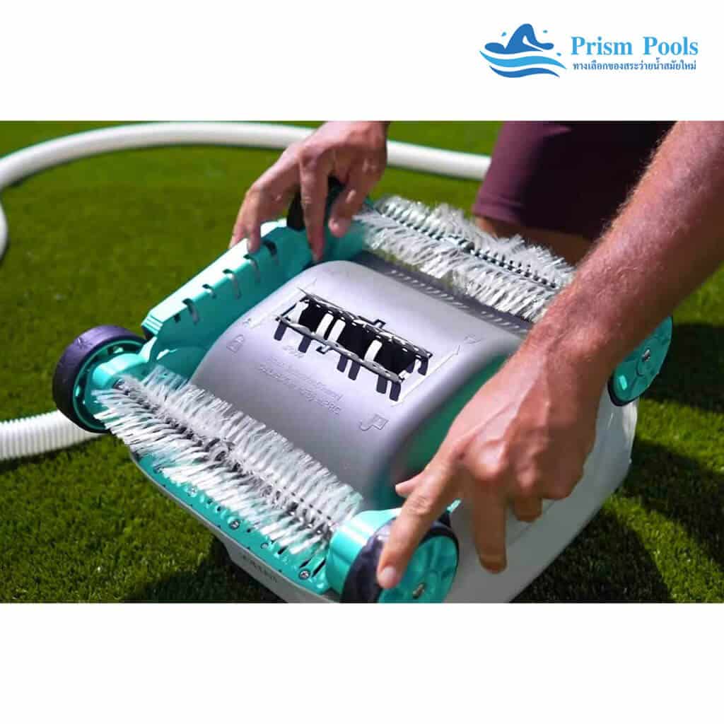 – การทำความสะอาด: มีระบบขับเคลื่อนสี่ล้อ (water-powered all-wheel drive) และแปรงขัดคู่แบบหมุนได้ (rotating dual dirt scrubbers) เพื่อขจัดสิ่งสกปรกละเอียดและคราบตะไคร่น้ำ สามารถทำความสะอาดได้ทั้งพื้นสระและปีนขึ้นไปทำความสะอาดผนังสระได้ถึงขอบน้ำ